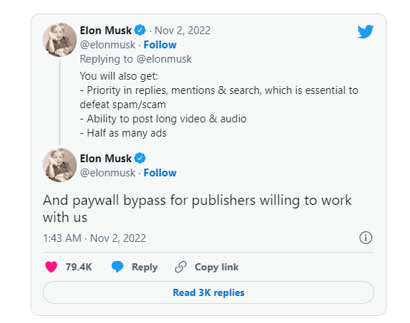 截至目前,马斯克的推文似乎没有提供更多关于这项特殊福利的细节,但「绕过付费墙」的推文似乎表明,作为「Twitter Blue」订阅的一部分,用户有一天可以绕过参与出版商的付费墙。如果这最终成为事实,这项福利可能比无广告阅读体验更好。