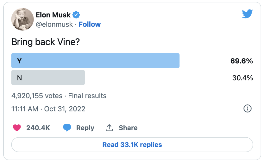 果然,10 月 31 日凌晨,马斯克就在推特上问道:「让 Vine 回归?」。但在对 200 多万人进行的民意调查中,仅有 69% 的人支持其回归。
