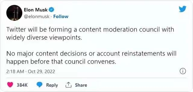 此外,马斯克在 10 月 28 日表示,他计划成立一个「内容审核委员会」,为公司作出重要的审核决定。