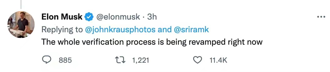 10 月 29 日,他在推特上说,「整个验证过程现在正在进行改革」。