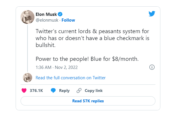 接着,在周一,马斯克在 Twitter 上正式发文称,「Twitter Blue」的订阅费用将从现在的每月 4.99 美元变为每月 8 美元,涨价 60%。