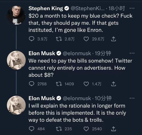在Twitter上透露「蓝V认证」将涨价,被传奇恐怖小说家史蒂芬·金痛批;
