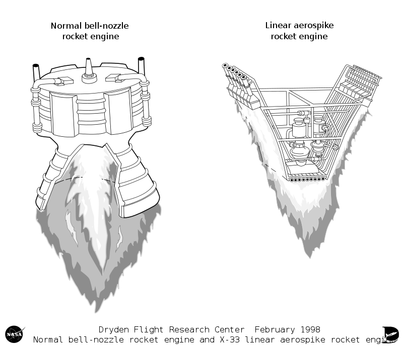 90 年代,美国赞助洛克希德马丁开始「冒险之星」计划的研发——单级入轨、可重复性使用、无人驾驶的航天器目的是取代航天飞机。研制成功的话,预计可使发射成本降低 90%。为此,洛克希德马丁先缩小尺寸(二分之一)研发验证机 X-33,采用 XRS-2200 气尖喷管发动机。NASA 为此投入了 9.2 亿美元,事故频发让投入变成无底洞,该项目在 2001 年终止。