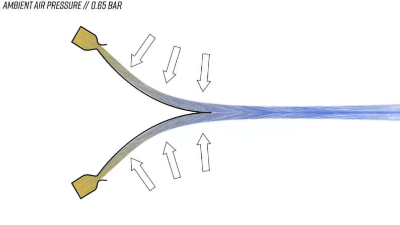 相比钟型喷管,气尖结构并非喷管包裹着气流,气流是一个「半受限」状态,外侧是自由膨胀边界,内侧受到壁面约束,产生推力。位于海平面时,较高的周围气压将气流推向喷嘴壁,随着高度升高,气流所受压力变小,气流自动形成一个「虚拟」的口径变大的喷嘴。以此适应不同气压环境,因此也被称为(海拔)高度补偿喷管。