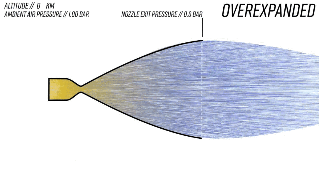而低于周围压力的超音速流体会形成冲击波,形成压缩——膨胀——压缩——膨胀的循环现象,也是俗称的耀眼的「马赫环」。这不仅是效率低下的表象,如果周围大气「挤进」喷嘴太多,冲击波和瞬间压力峰值造成气流分离(flow separation),严重时导致喷管结构破坏等后果。