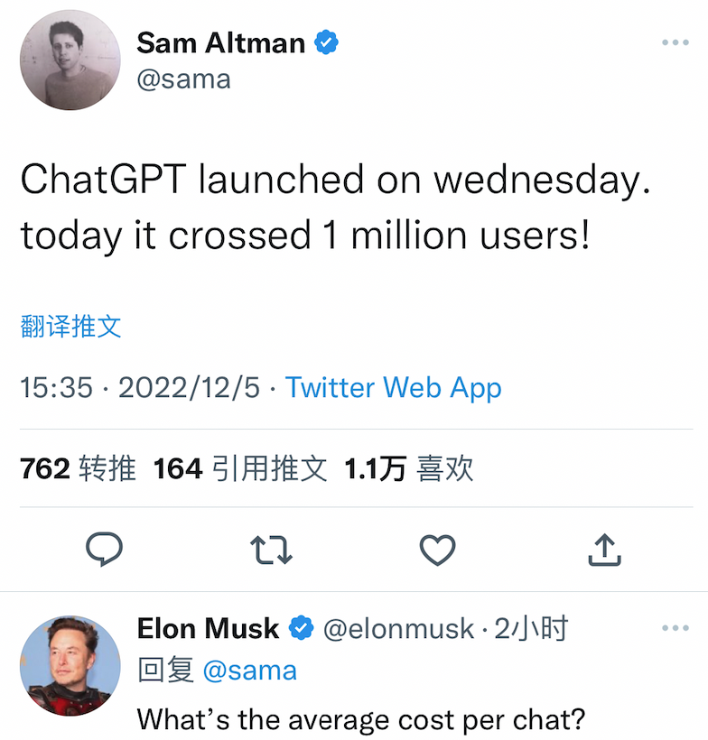 推特下面第一个留言的就是伊隆·马斯克,问 ChatGPT 每回答一个问题的成本是多少(大约几美分)。