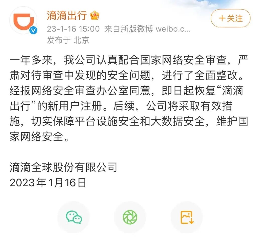 2023 年 1 月 16 日 15 时,@ 滴滴出行 在微博发文称,一年多来,我公司认真配合国家网络安全审查,严肃对待审查中发现的安全问题,进行了全面整改。经报网络安全审查办公室同意,即日起恢复「滴滴出行」的新用户注册。后续,公司将采取有效措施,切实保障平台设施安全和大数据安全,维护国家网络安全。