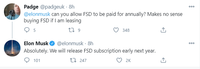 马斯克宣布 2021 年将推出自动驾驶订阅服务|Twitter