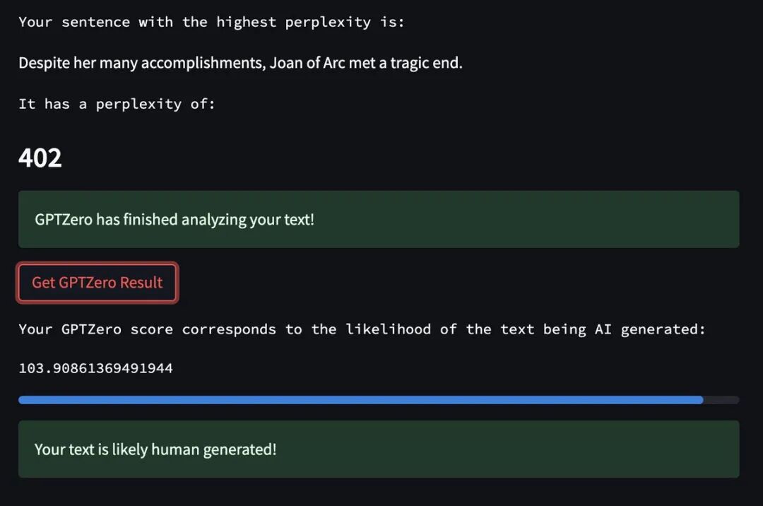 这个指标主要是衡量文本在一个句子中的随机程度,以及一个句子的构造方式是否会让 GPTZero 感到困惑。