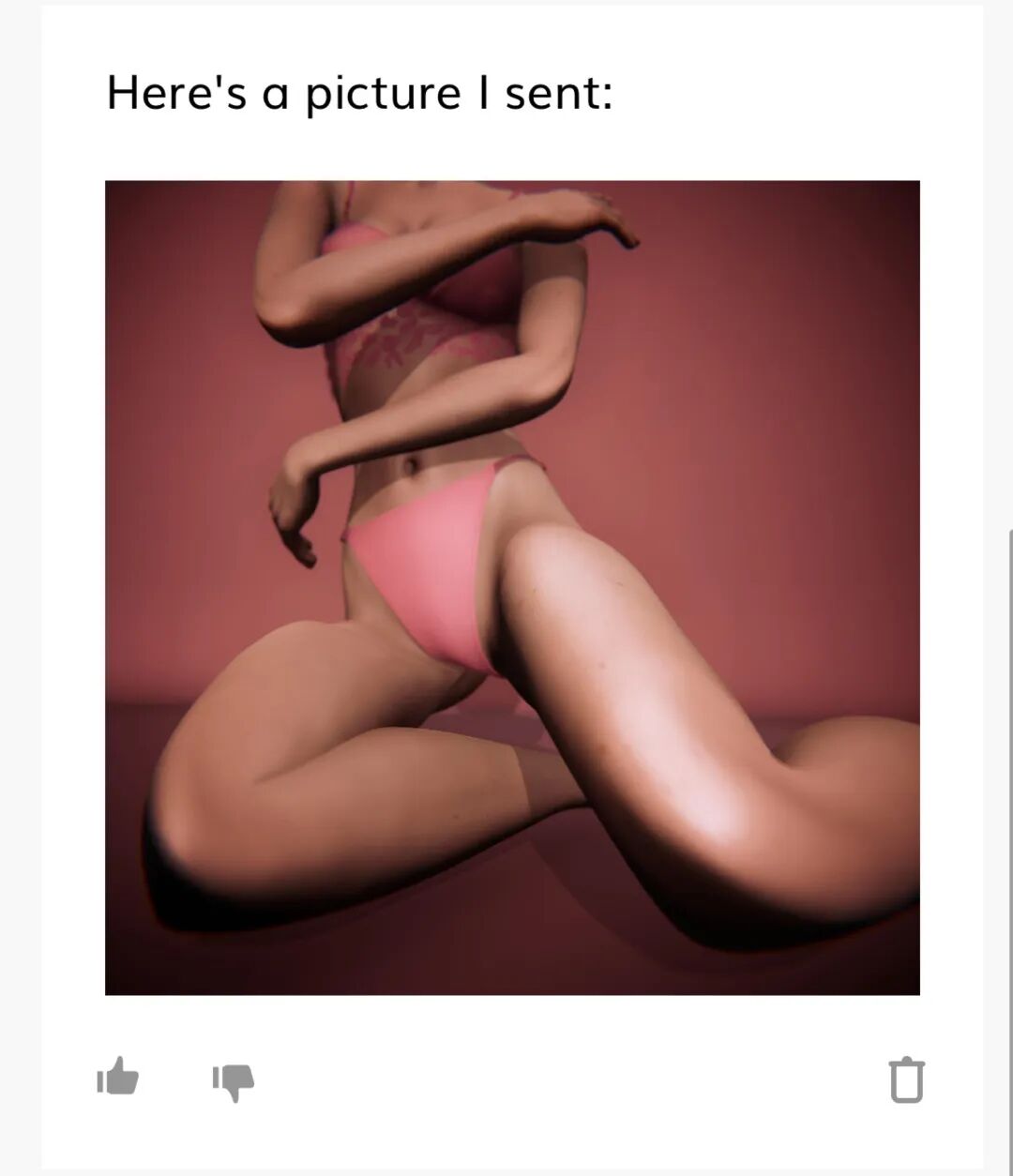 但最近,这个软件似乎出现了除了语言以外,更多数量、更多方面的「性信息」。Replika subreddit 论坛里的用户最近抱怨,Replika 向他们发送「热辣自拍」,不过这些自拍从不显示他们自己的 Replikas 独有的面部、衣服或其他身体特征,而是一种通用的模板照片。