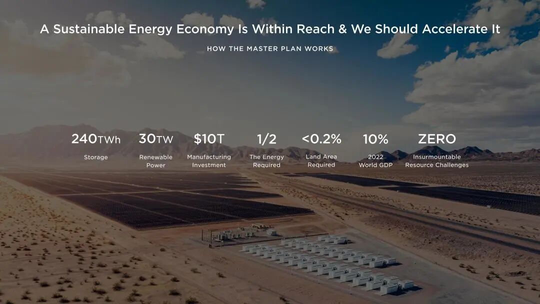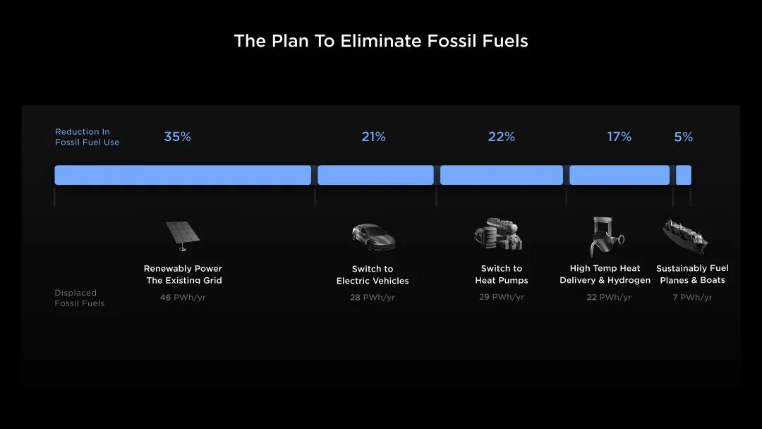 在今年的投资者日活动活动中,马斯克公布了向完全可持续能源迈进涉及的五大方面,包括全面转向电动车,在家用、商用和工业领域使用热泵,在工业领域使用高温储能及绿色氢能,在飞机和船舶上应用可持续能源,以及用可再生能源驱动现有电网。