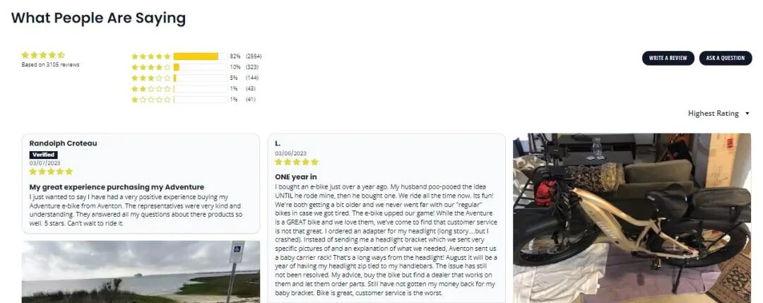 每款车型的下方都会有 Review(评价)区,购买过同款产品的消费者可以用文字、返图表达个人对于 Aventon 产品的评价,即便是对于差评,Aventon 也并没有隐藏,而是很认真地回复并积极提供解决办法。