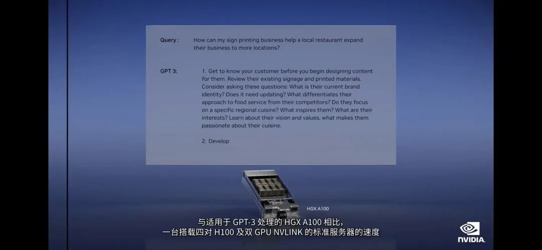 基于英伟达的 Hopper 架构,H100 采用 Transformer 引擎,被设计用于专门处理类似 GPT 这样的模型。与用于 GPT-3 处理的 HGX A100 相比,一个搭载四对 H100 和 NVLINK 的标准服务器的处理速度快 10 倍。根据官网数据,H100 的综合技术创新。可以将大型语言模型的速度提高 30 倍。