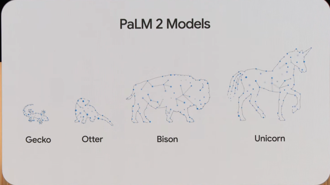 为了让模型的能力更灵活地服务于产品,Pichai 特地强调,PalM2 有四种不同的尺寸,分别以动物的名称命名:壁虎、水獭、野牛和独角兽。其中壁虎(Gecko)最轻量级的版本。