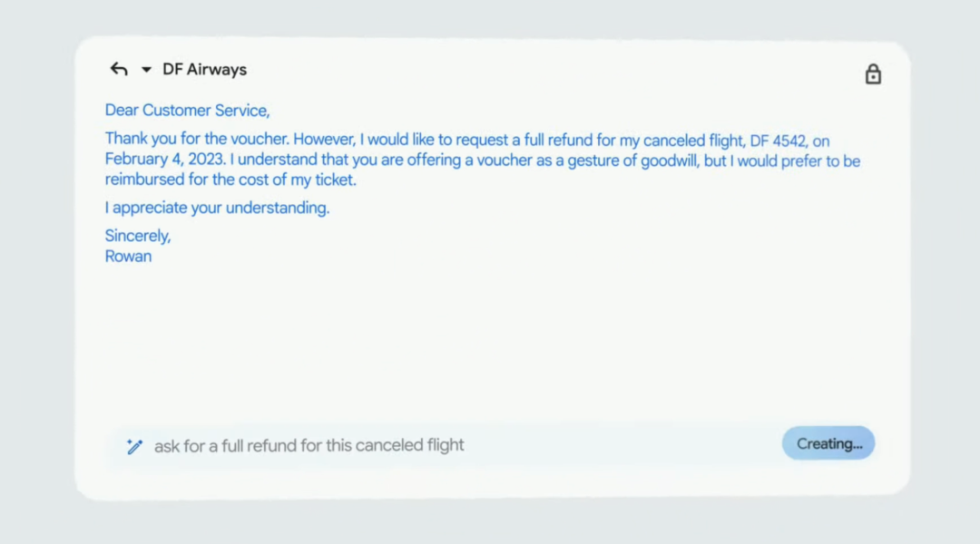 比如,航空公司发来航班取消的邮件,表示会送上代金券作为补偿,这时候你可以让 AI 帮你写一个全额退款的邮件,它就会结合具体邮件内容,撰写全文。