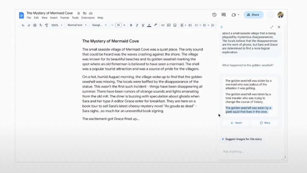 Google Workspace 是谷歌推出的多人协作软件,现在无论是写作文案、故事写作、制作幻灯片、制作表格,都可以用上 AI 了,形式类似于微软的 Copilot,在工作的主界面右侧有一个边栏,谷歌将其称为「sidekick」,AI 会在这里提出文章的修改意见、建议生成配图、表格的样式,用户选择合适的结果,就可以将 AI 生成的内容移入主界面。