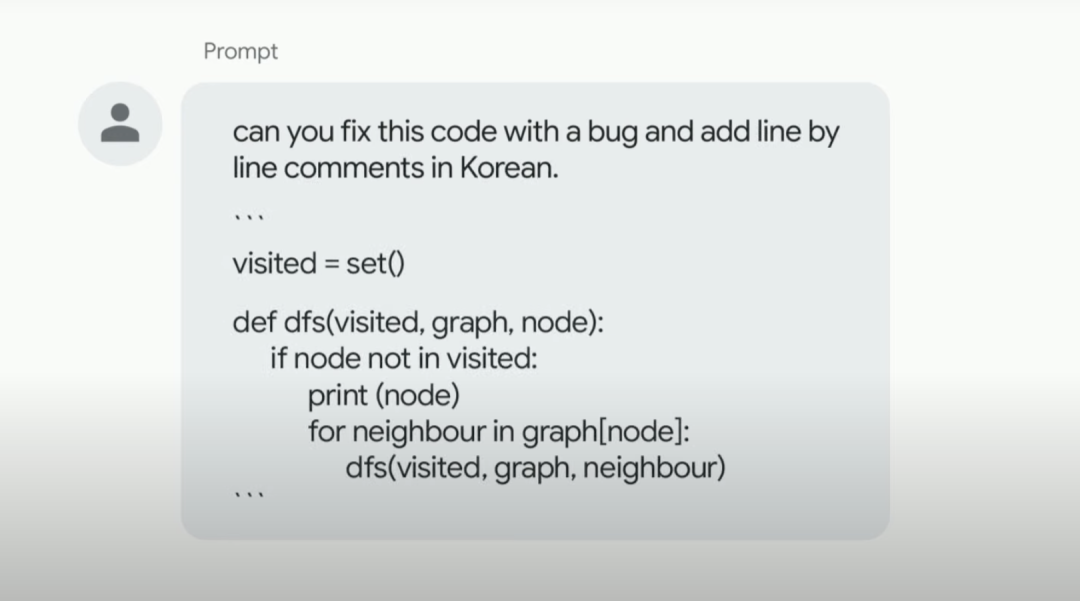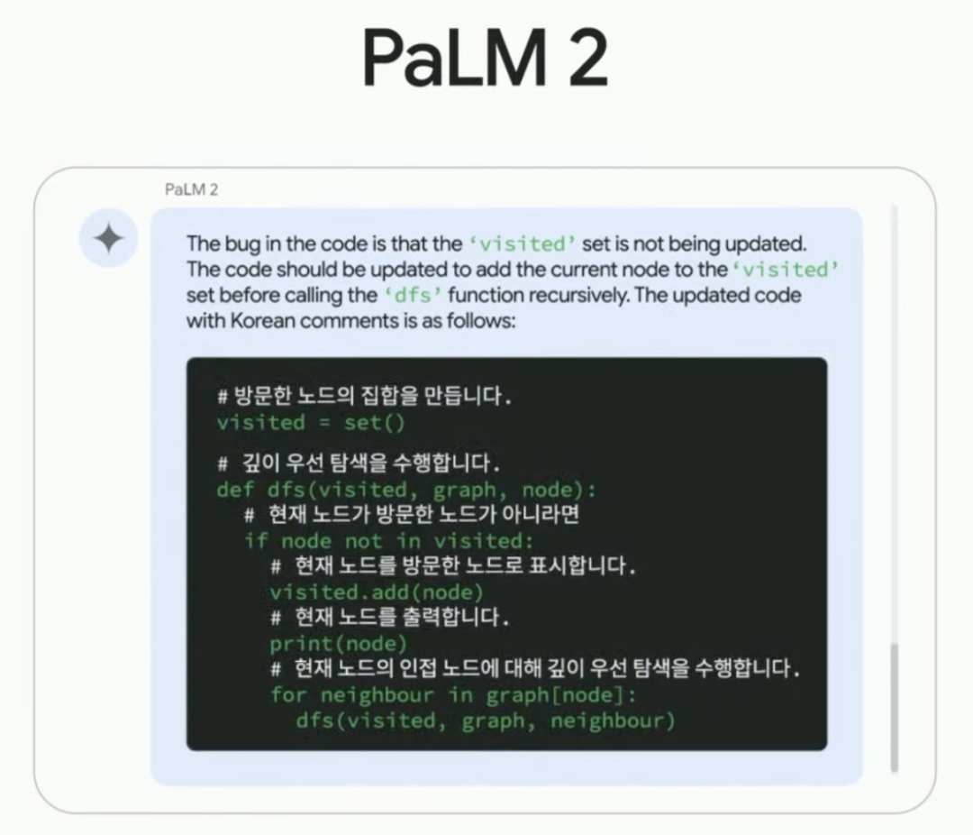 Pichai 现场展示了一个修改 Bug 后,用韩语对代码进行解释的例子: