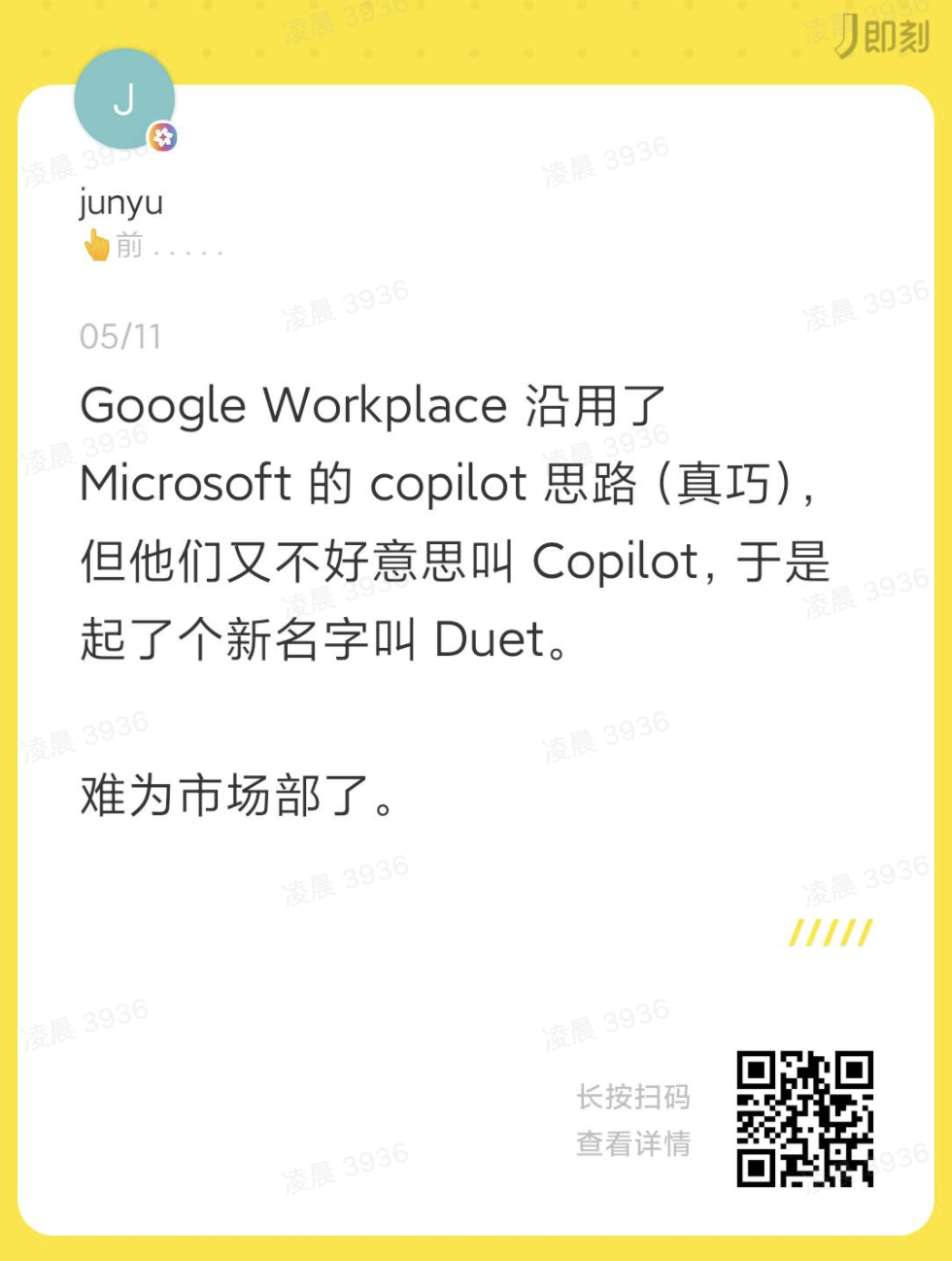 阅读室、豌豆荚创始人,同时也是谷歌前员工的王俊煜对此吐槽,这个产品设计就是沿用了 Microsoft 365 Copilot 的思路,但是换了个「Duet AI」的名字。