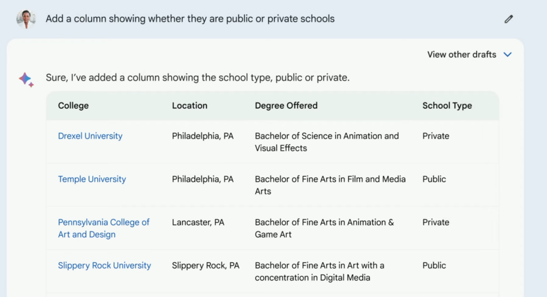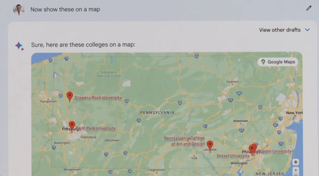 谷歌地图、图表能力也能够直接在 Bard 中调用。现场演示给了一个例子,用户通过提问得到了几所符合自己报考目的大学名单,让 Bard 在地图中将这几个学校的地址标出来,再让 Bard 根据学习的专业、排名、地址等相关信息生成对比表格。