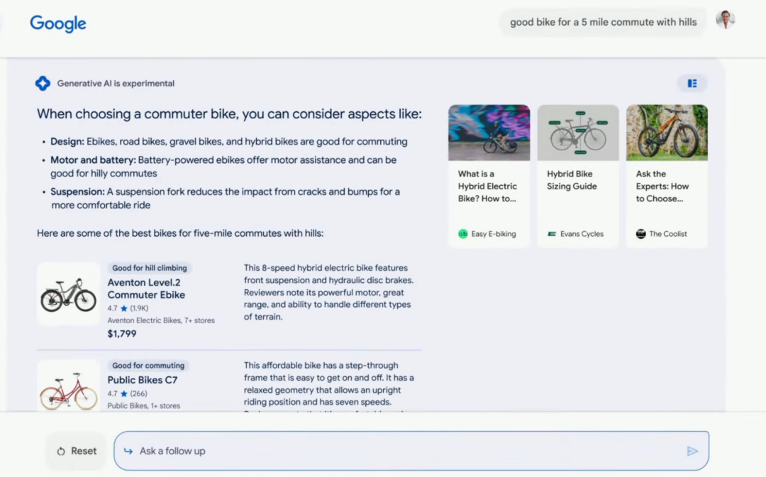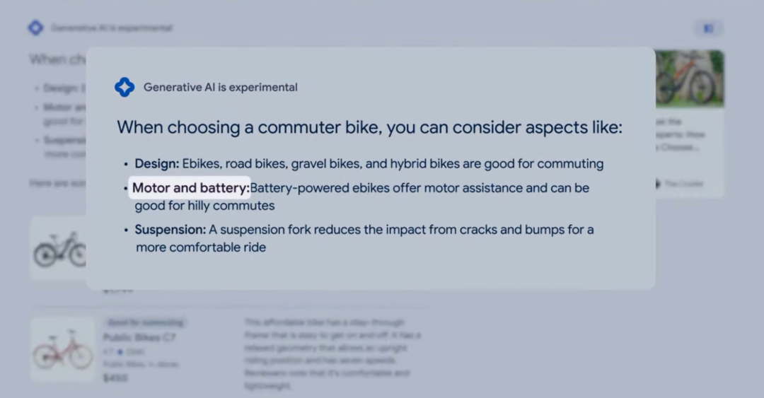 现场演示了对比景点、购买 ebike 两个例子。搜索即是决策过程,AI 生成要点提供了思考的框架,并提供相关链接,用户可以通过对话深挖信息。