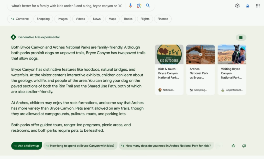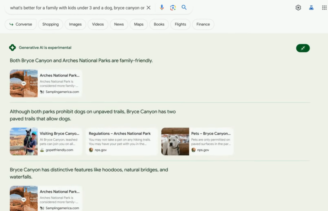 有 3 岁以下的孩子和狗狗的家庭,Bryce Canyon 和 National Parks 哪个更适合?在这个案例演示中,Generative AI 汇总提炼了两个景点的优劣,并且提供了几篇参考链接,如果用户有需求,可以打开参考链接阅读,而且链接文章也会根据不同的内容重点进行分类。