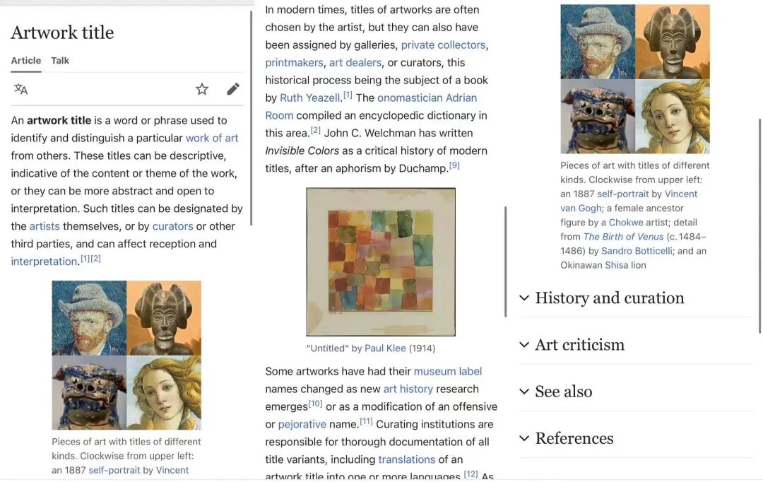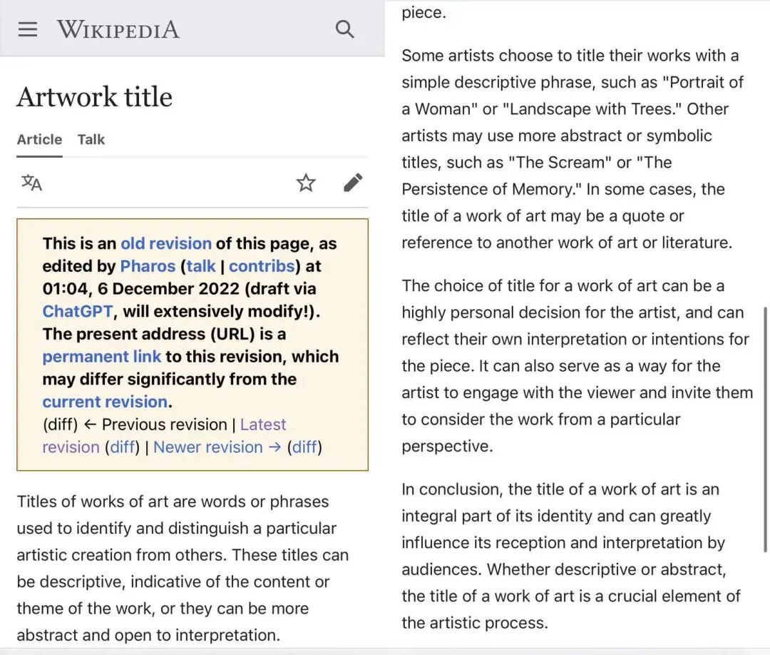 纽约市维基媒体分会的老维基人 Richard Knipel 就用 ChatGPT 在维基百科上起草了一个名为「艺术作品标题」的新条目,Knipel 表示,ChatGPT 给出的版本一般但语法正确,定义了艺术作品标题的概念,给出了从古至今的例子。他在草稿基础上只做了轻微修改。