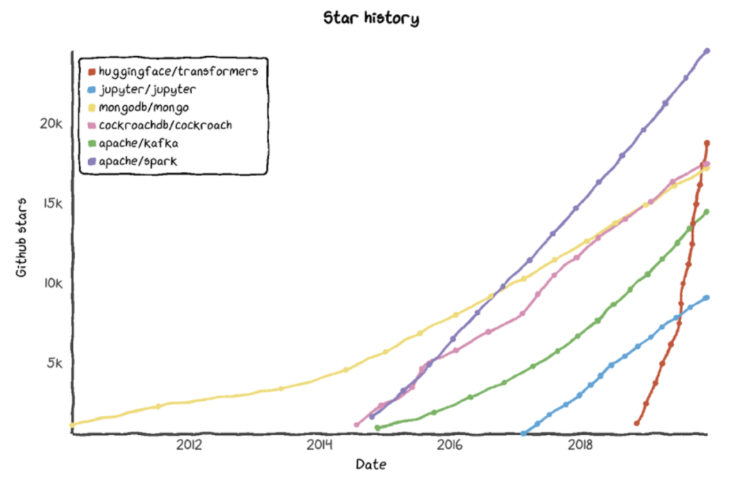 Hugging Face 在 Github 上的 Star 曲线,图片来自于 Lux Capital