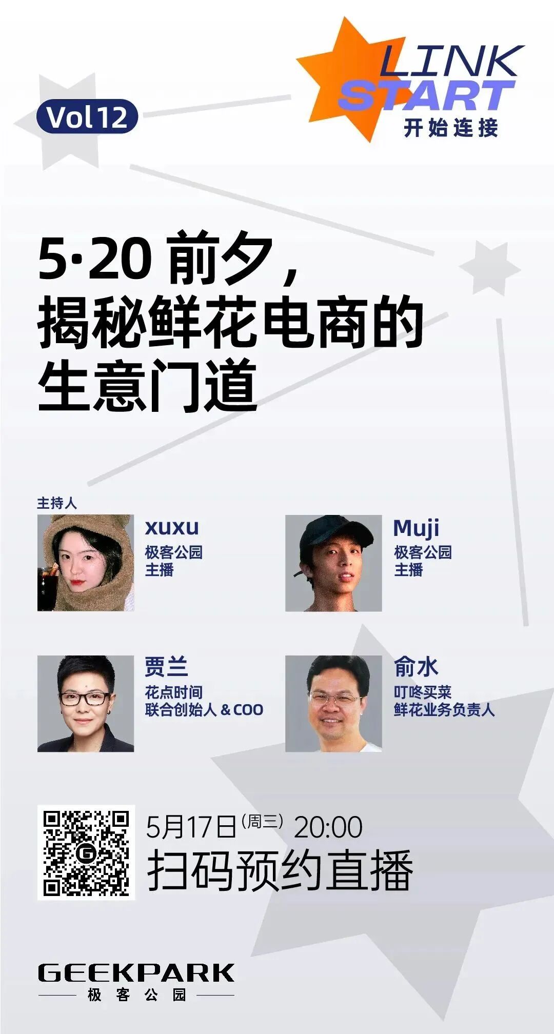本周三晚 8 点,极客公园邀请到花点时间联合创始人、COO贾兰,以及叮咚买菜鲜花业务负责人俞水共同来到「开始连接」直播间,和大家分享自己的鲜花创业故事,揭秘鲜花电商的门道在哪儿,和传统卖花模式相比又有什么区别。