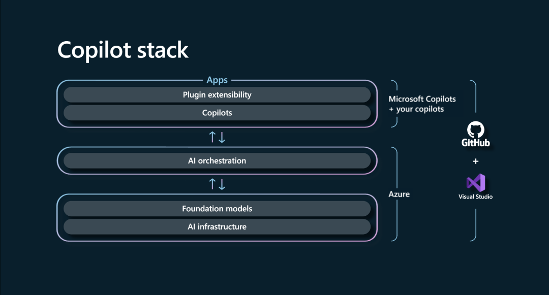 不止提供全方位的 copilot,现在,微软还提供怎么制作 copilot 的服务。纳德拉表示:「我们已经用一个通用的架构堆栈构建了所有这些 copilot。现在,我们希望使其可用,每个人都可以为他们的应用程序构建自己的 copilot,从 AI 基础设施到基础模型再到 AI 编排的一切,一直到 copilot 及其可扩展性。」