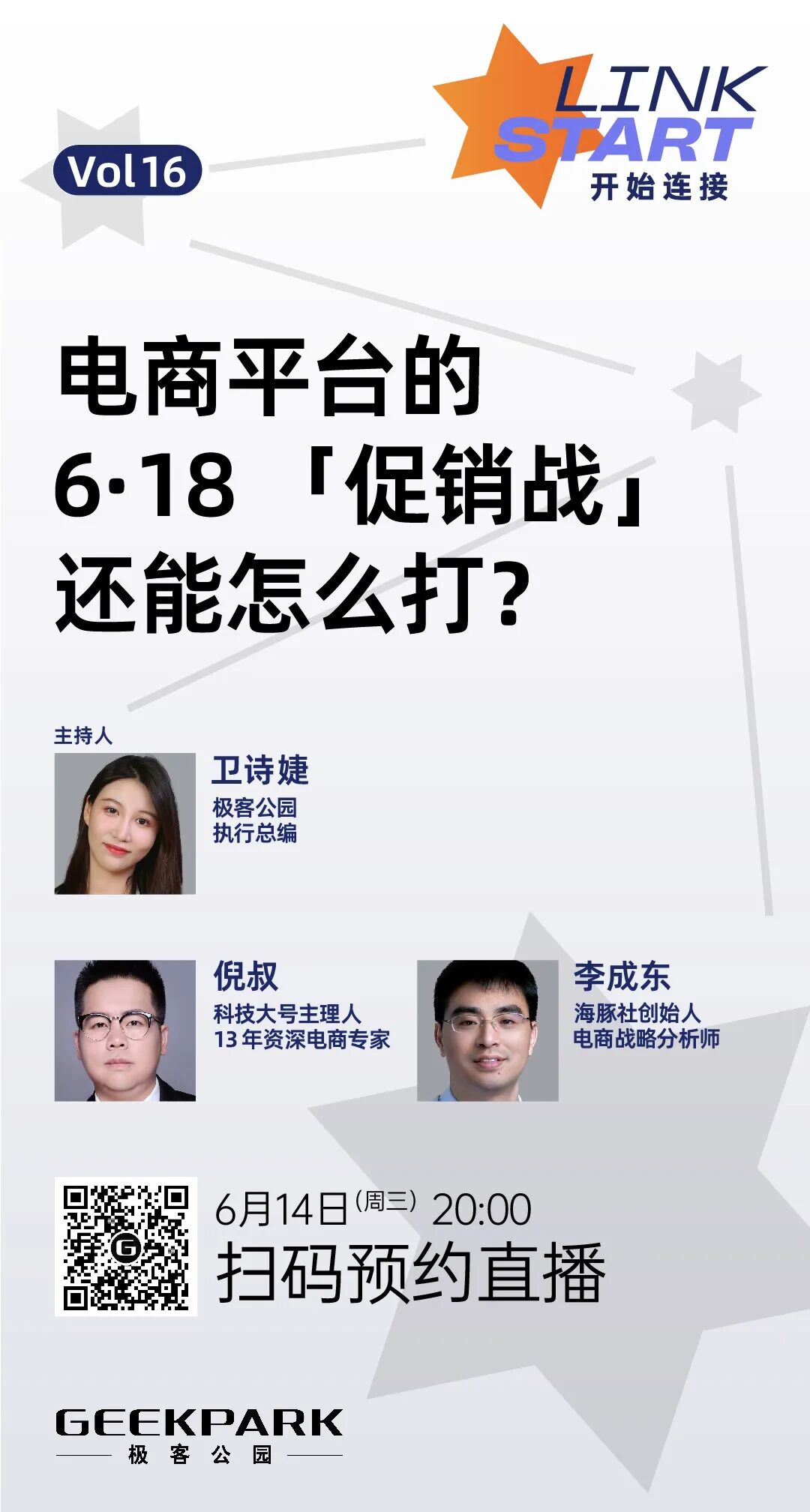 本周三晚 8 点,极客公园「开始连接」直播间将请到科技大号主理人、13 年资深电商专家倪叔,以及海豚社创始人、电商战略分析师李成东,为你打开看待 6·18 的新视角,带你深度剖析各大电商平台「促销战」背后的故事。
