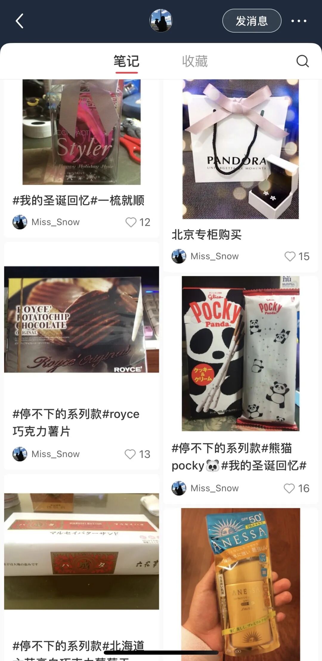 小红书的典型早期用户「Miss_Snow」,在 2015 年前后,分享的笔记仍然是密密麻麻的美妆产品、生活日用品。