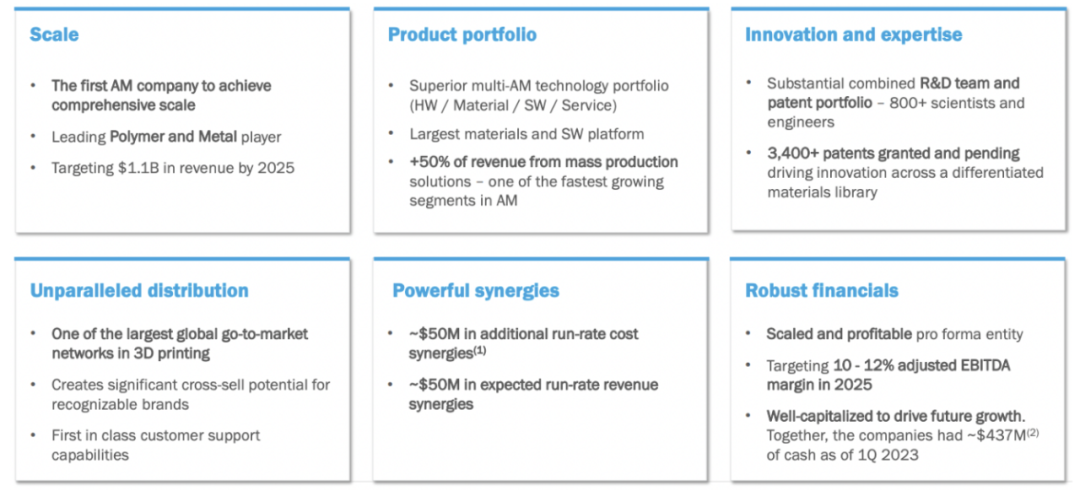 这项交易建立了一个规模独特的增材制造(AM)公司,合并后的企业预计在 2025 年将实现 11 亿美元的营收,并在这样一个规模巨大的市场中持续保持上升潜力,有望成为业内规模最大的企业之一。