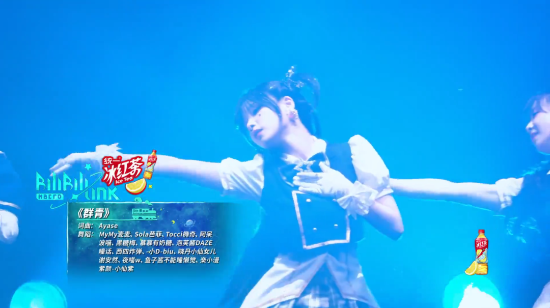晚会的第一个节目是多名 UP 主合作演唱歌曲《群青》,这是一首根据漫画《蓝色时期》创作的歌曲,刻画的是形似不良少年实则成绩优异的主人公,在不被理解的环境中艰辛成长的故事。