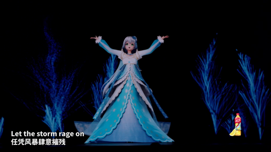 最后,当《冰雪奇缘》主题曲《Let it go》的旋律响起,洛天依穿上一身冰雪公主的 cosplay 起舞,魔法与虚拟融合,现场的气氛也被烘托到了高潮。