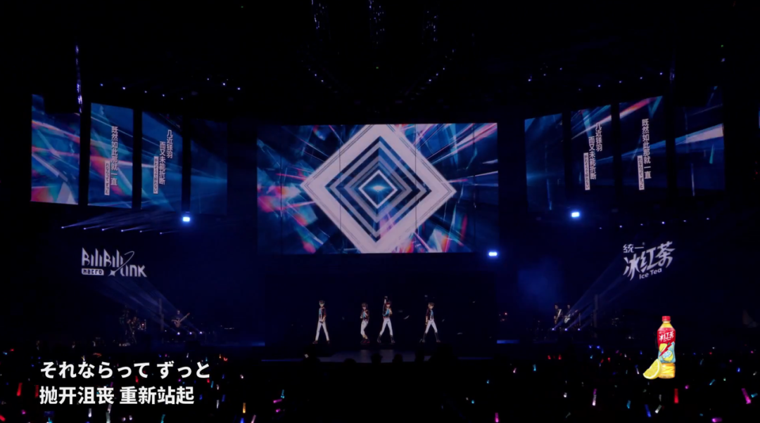 《群青》过后,是 B 站的「私货」时间。第二个登场的是 B 站参与制作和发行的国产动漫《时光代理人》,由原唱白鲨 JAWS 乐团演唱了改编的动画主题曲;接下来 B 站参与发行的国产女性向二次元手游《偶像梦幻祭 2》出场,在虚拟人技术的加持下,游戏中的虚拟偶像男团 ALKALOID 连演了两场。