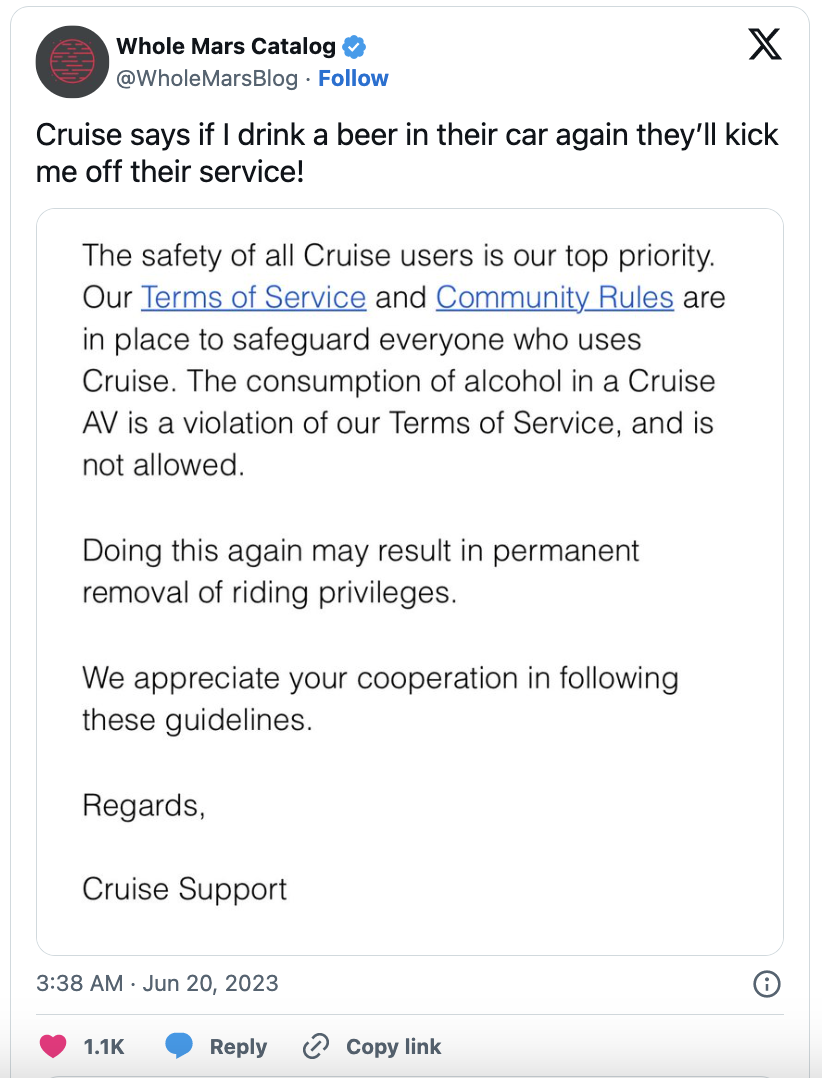 因此,Cruise 和 Waymo 喜欢吹嘘他们的汽车永远不会酒后、嗑药或受损驾驶,尤其是 Cruise,它坚持对其摄像头拍到的在车内饮酒的用户进行严厉打击。比如,有一名乘客是热门科技社交媒体账号 Whole Mars Catalog 的作家,他就曾因为在 Cruise 汽车后座上喝了一罐啤酒而受到了 Cruise 公司的书面警告。