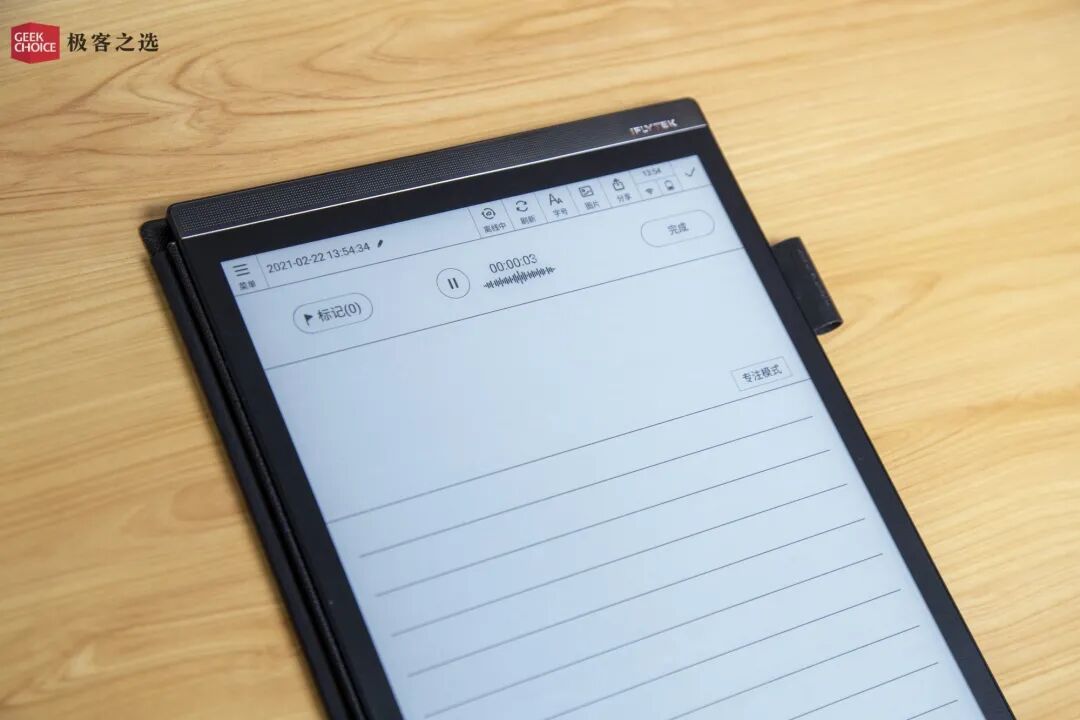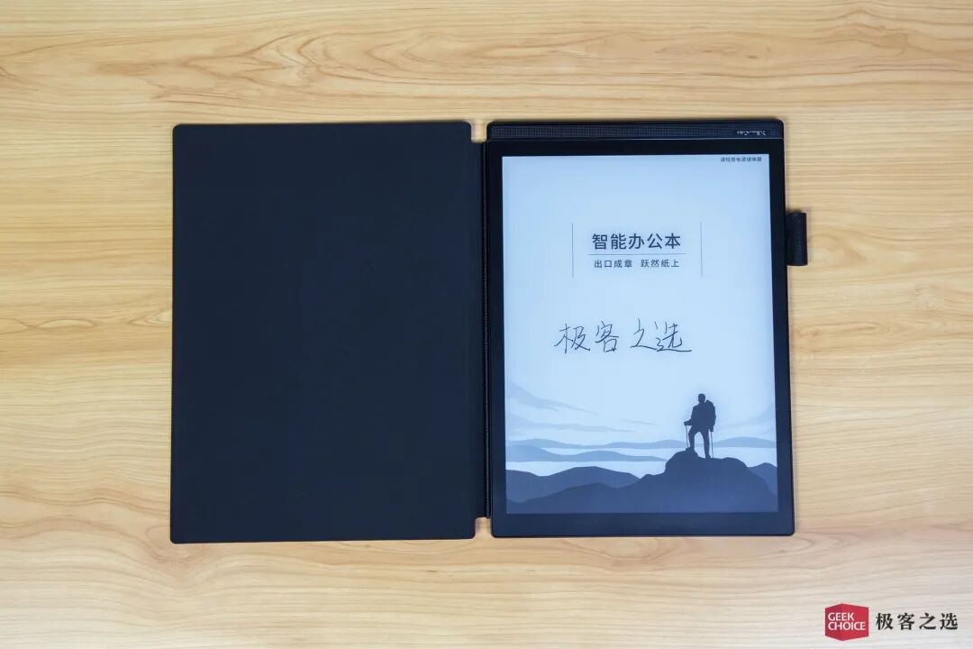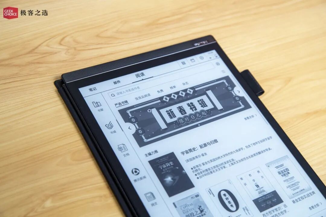 先来看看外观,10.3 英寸的电子墨水屏,正面上部是四麦阵列和扬声器,皮套和笔套是可拆卸设计,据说后面会推出替换配件。机身背面摸起来顺滑了许多,看起来也更高级。虽然不是磨砂质感,但也不用担心太滑,毕竟这么大的体积,使用时基本都是抓在手里。