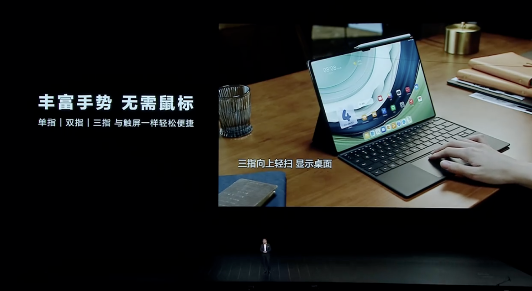 在键盘中,也配备了一个触控板,可以使用触控板进行单指、双指和三指的触控操作。搭载了鸿蒙系统,华为平板可以支持桌面卡片、华为打印、超级中转站、超级终端等功能,余承东称之为办公上甚至「超过 pc 的能力」。