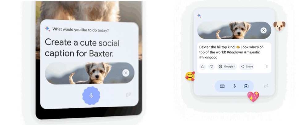 例如,假设 Pixel 手机用户刚刚拍了一张可爱的小狗狗照片,只需让Assistant with Bard 漂浮在照片上,并语音要求它编写社交帖子。Assistant with Bard 就可以用图像作为视觉提示,理解上下文并生成内容。谷歌高管称「这种对话叠加层是一种全新的与手机互动方式。」