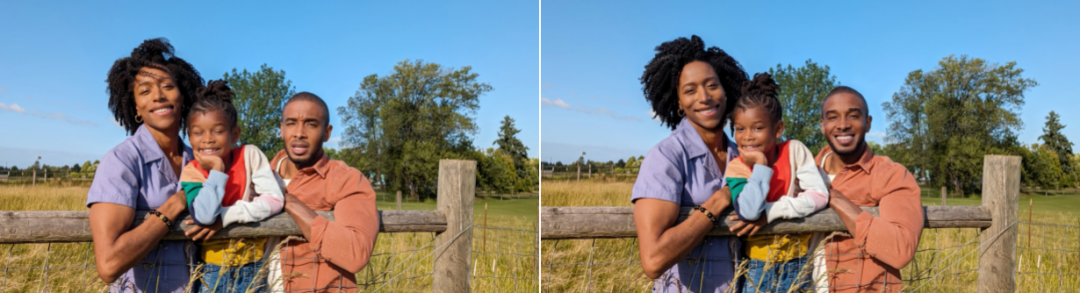 而比相机更有意思的是它的编辑工具。「我们都曾经有过这样的情况,拍摄了一张完美的团体照,但有人没有看向相机。」通过生成式 AI,Google Photos 中的 Magic Editor 可以利用已经拍摄的照片,手动从其他照片中选择另一个表情,生成一张新的照片,达成拍摄者想要的效果,让「每个人都睁着眼睛」。