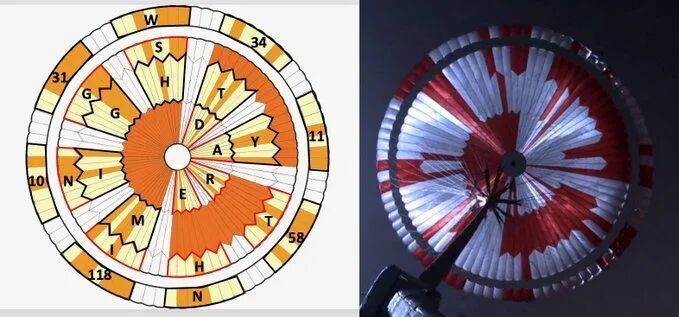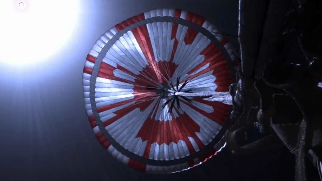 抵达火星表面之后,NASA 公开了毅力号「第一视角」的登陆视频。整段视频从背罩上的相机记录降落伞打开开始,降落伞不是「清一色」,而是红白条纹穿插构成,给降落伞设计不同图案原本用意是确定降落伞的方向位置。然而视频发出不到 6 个小时,就有网友发现,JPL 用意绝非那么简单。
