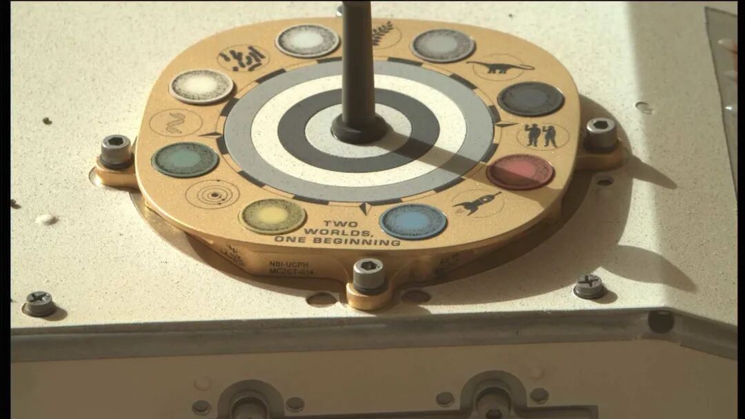 在标定板的侧面,JPL 写着「Are we alone? We came here to look for signs of life, and to collect samples of Mars for study on Earth. To those who follow, we wish a safe journey and the joy of discovery.」(我们是孤单的吗?我们来这儿寻找生命的迹象,收集火星样本带回地球研究。对于未来的探索者,祝你们一路平安,也有发现的喜悦。)Joy of Discovery(发现的喜悦)又被翻译成不同语言。