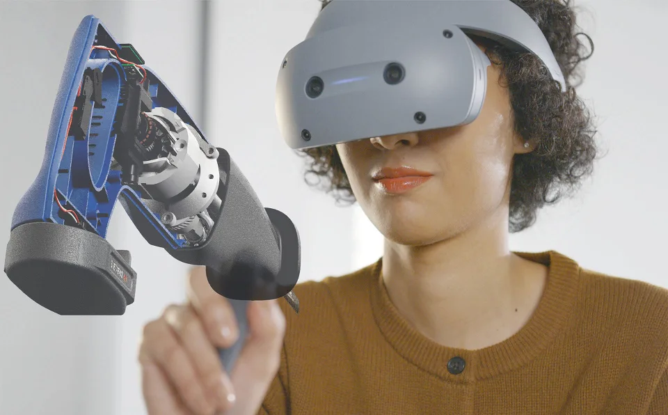 该设备采用高通技术公司最新的 XR 处理器 Snapdragon® XR2+ Gen 2,并配备 4K OLED 显示屏。系统配备总共六个摄像头和传感器,实现视频透视功能和空间识别。此外,系统还包括一个环形控制器,允许用户直观地操作虚拟空间中的对象,以及一个指向控制器,实现精确定位。这使得创作者可以在佩戴头戴显示器的同时使用控制器和键盘进行虚拟空间中的创作。