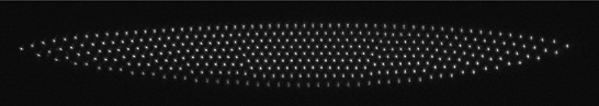 我们目前是以二维离子晶体的方式来构建量子计算机。也就是说离子量子比特不再是排布成一条直线,你可以认为它是 n 条直线在空间中排布成一个类似于二维的菱形。