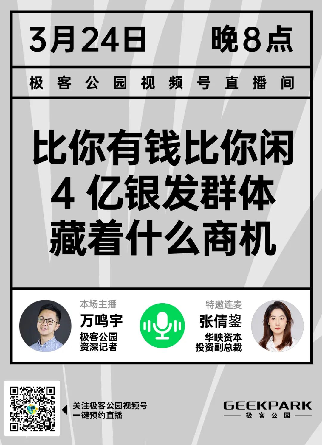 3 月 24 日(星期日)晚 8 点,极客君将在视频号直播间发起一场关于银发经济的讨论。我们还会现场连麦华映资本投资副总裁的张倩鋆,来极客公园视频号直播间,聊聊银发经济的那些事儿。