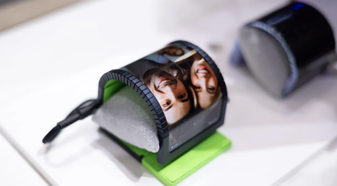 三星公司也不甘示弱,展示了一款手机——手镯概念,它可以从外观普通的手机变为可戴在手腕上的弧形屏幕。