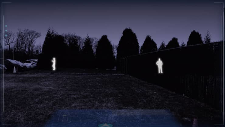 在烟雾环境中,军方目前所用的夜视镜就没那么好用了,士兵可能会被挡住视线。所以,IVAS 加入了热成像功能。即便在无光的野外,记者在戴上眼镜后也能看到周围人身上发出白色亮光,即使是躲在障碍物后面的人也能被识别。