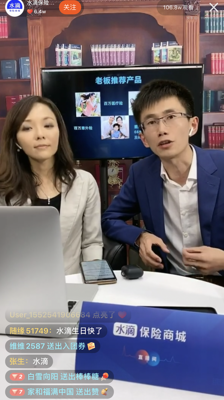 受年初疫情影响,水滴本来一个线下的健康专家分享会无法如期举行,团队将活动搬到线上变成了直播分享。出乎意料,这场线上直播分享,最终带来了几百万的保费。这次成功让水滴团队意识到了直播的能量,并在内部组建相关团队进行直播带货方面的探索。