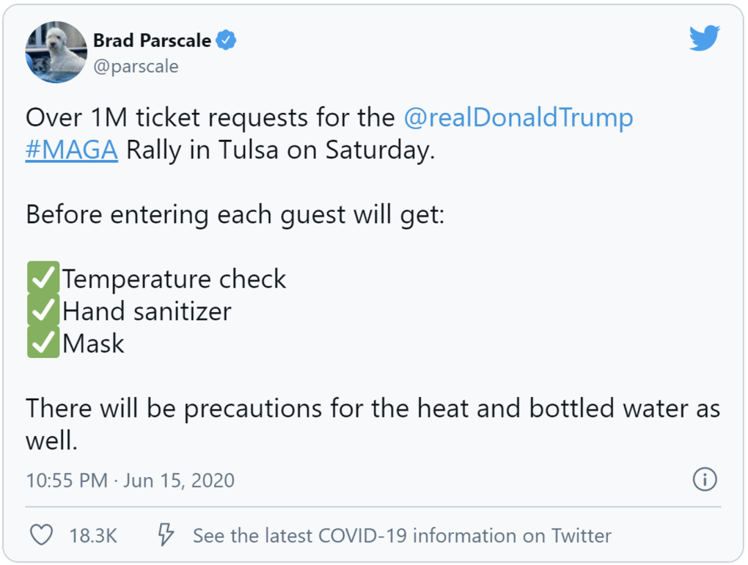 情况很快变得更加错综复杂。6 月底,特朗普计划在塔尔萨市、有 19000 个座位的奥克拉荷马银行中心举行一次大规模竞选集会。集会定于 6 月 20 日举行。在集会开始前 5 天,时任特朗普竞选经理 Brad Parscale 声称,在线免费门票申请数量已经超过了 100 万张。但在活动当晚,与会者人数明显不多,其中一个原因是反对特朗普的用户在 TikTok 上组织了一场运动,申请了免费门票却故意在当天「放鸽子」。