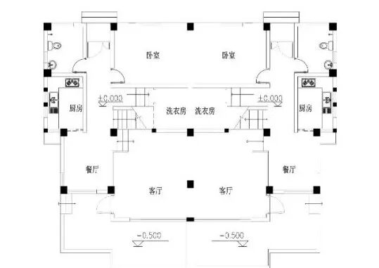 我们来看看建筑施工图功能布局,首次按看看一层,北边大门进来西边是卫生间、厨房、餐厅,东边是卧室、客厅,上楼上的楼梯,楼梯平台下方设有洗衣房,你和你兄弟姐妹儿布局一模一样,对称布局。